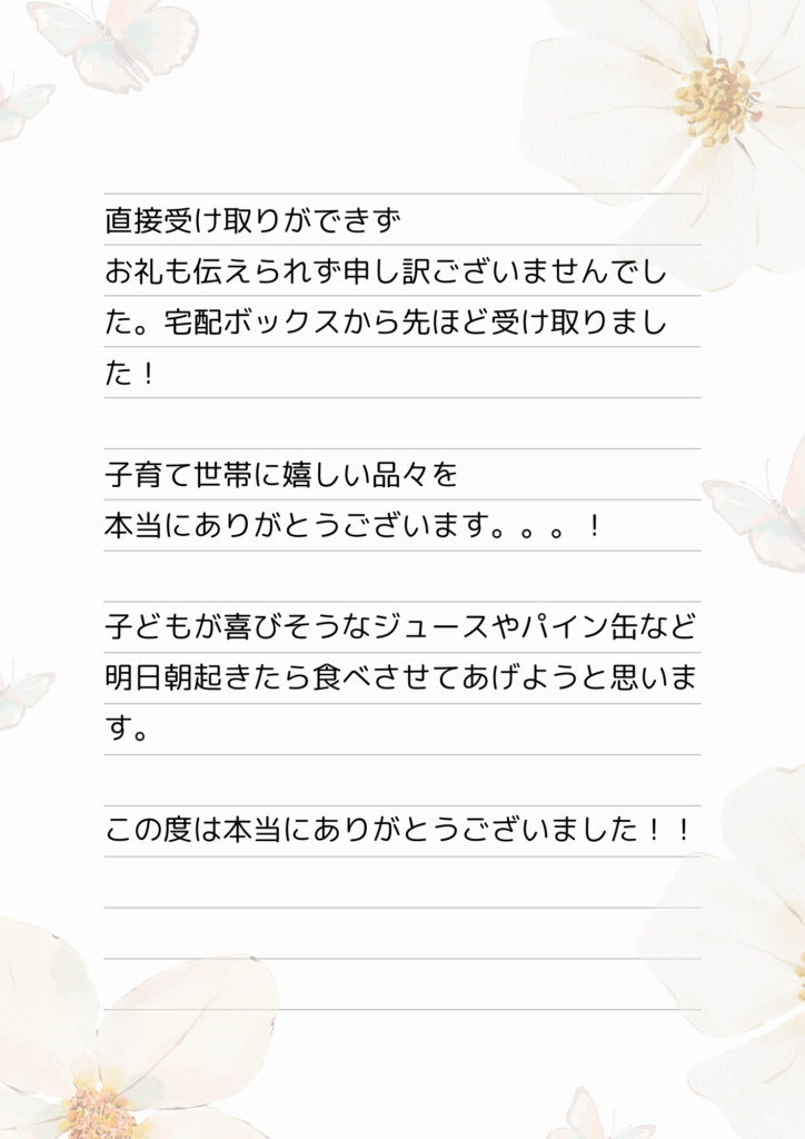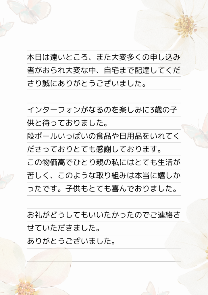 本事業実施にあたり、弊社拠点である京都市左京区以外からも希望の声が多く寄せられました。行政が拡散している情報について、登録者の居住区域別ではなく、登録者に対して一斉配信というかたちをとっているからだと思われます。最初は区外はエリア外としてお断りしようかと思いましたが、本当に支援が必要な方はフードパントリーなどに取りに来ることさえできない、と考えた結果、私達のできる範囲内でエリアを拡大することにしました。エリアが拡大した分、配達の手間などかかった部分はありましたが、お礼のメッセージ(下に掲載)などを拝読すると、支援を必要とする多くの世帯に届けることができたと思います。こども宅食事業者が負担なく本事業を実施するには半径5キロくらいが相当であると思います。事業実施者が増えていけば解決できると思います。