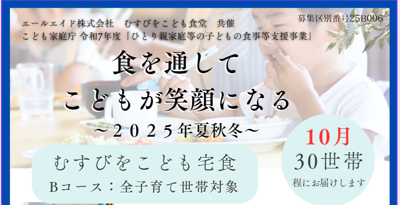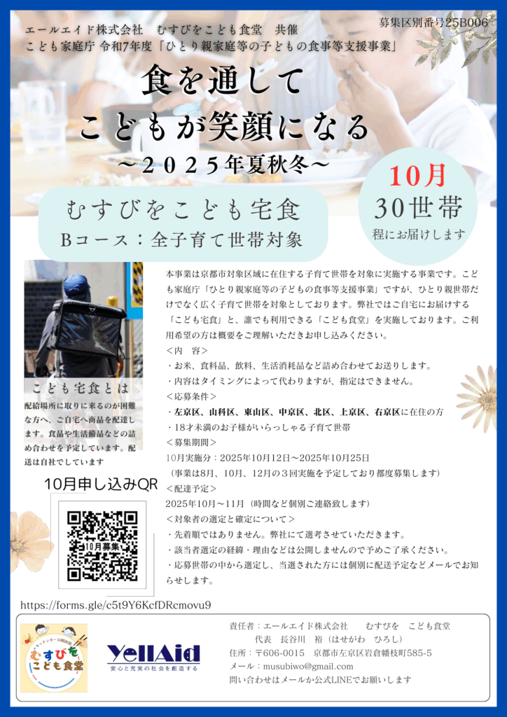本事業は京都市対象区域に在住する子育て世帯を対象に実施する事業です。こども家庭庁「ひとり親家庭等の子どもの食事等支援事業」ですが、ひとり親世帯だけでなく広く子育て世帯を対象としております。弊社ではご自宅にお届けする「こども宅食」と、誰でも利用できる「こども食堂」を実施しております。ご利用希望の方は概要をご理解いただきお申し込みください。