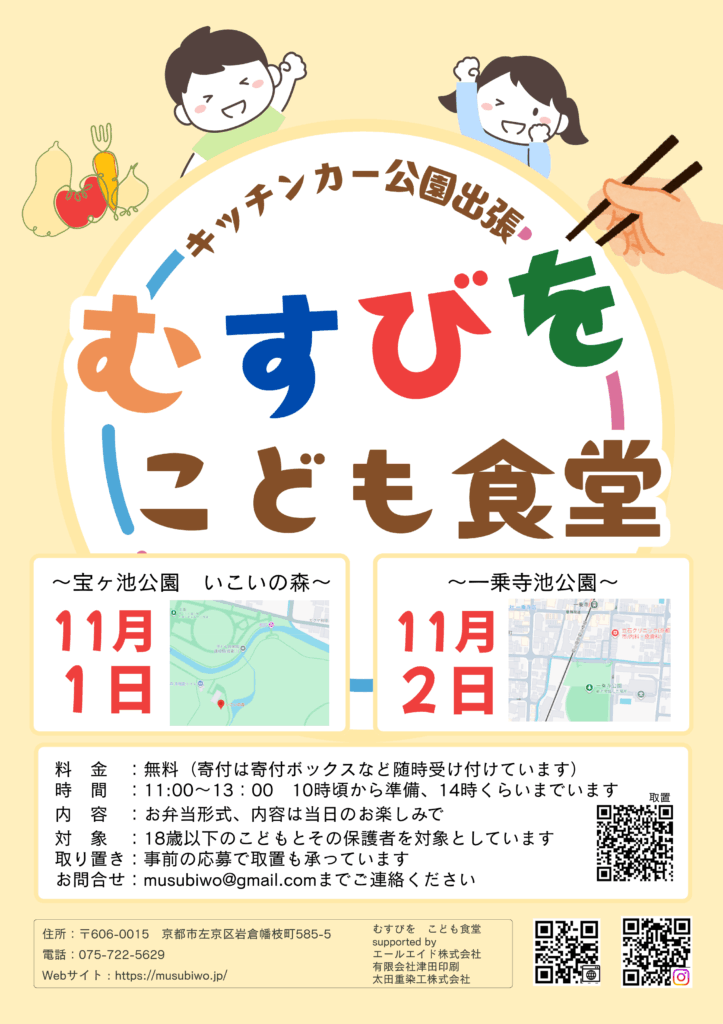 備 考:むすびをこども食堂は屋外での提供のため、衛生管理の観点からお弁当でのお渡しをしています。公園でお召し上がりいただいても構いませんし、お持ち帰りいただいても構いません。