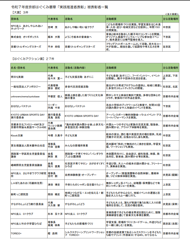 京都市では、子どもたちの今と未来のため、大人としてどう行動すべきかを示した「京都はぐくみ憲章(子どもを共に育む京都市民憲章)」の理念のもと、子どもを笑顔で温かく見守り、地域や社会の宝として大切に育む「はぐくみ文化」が息づくまちづくりを進めています。この度、京都はぐくみ憲章の実践活動に関して他のモデルになる活動や特色ある活動に取り組まれている個人・団体を表彰します。