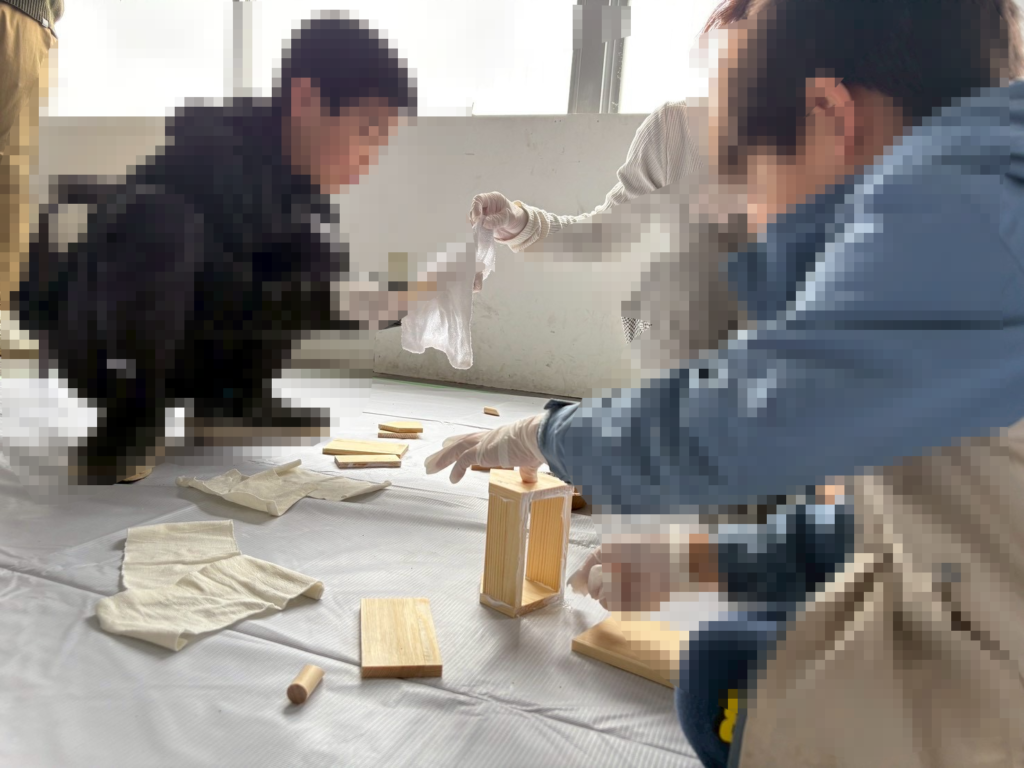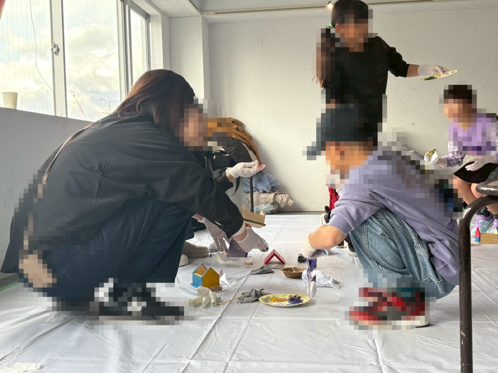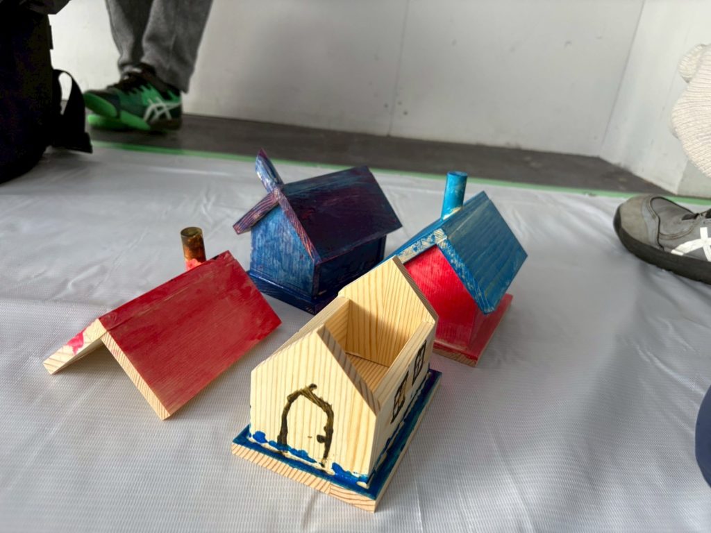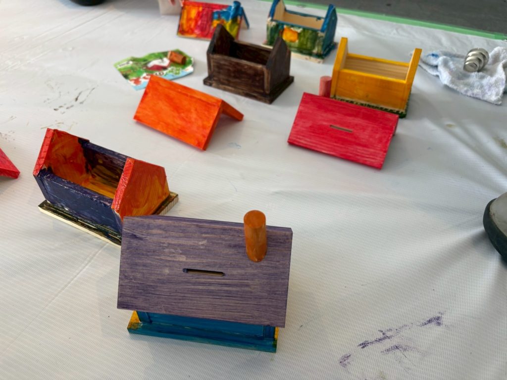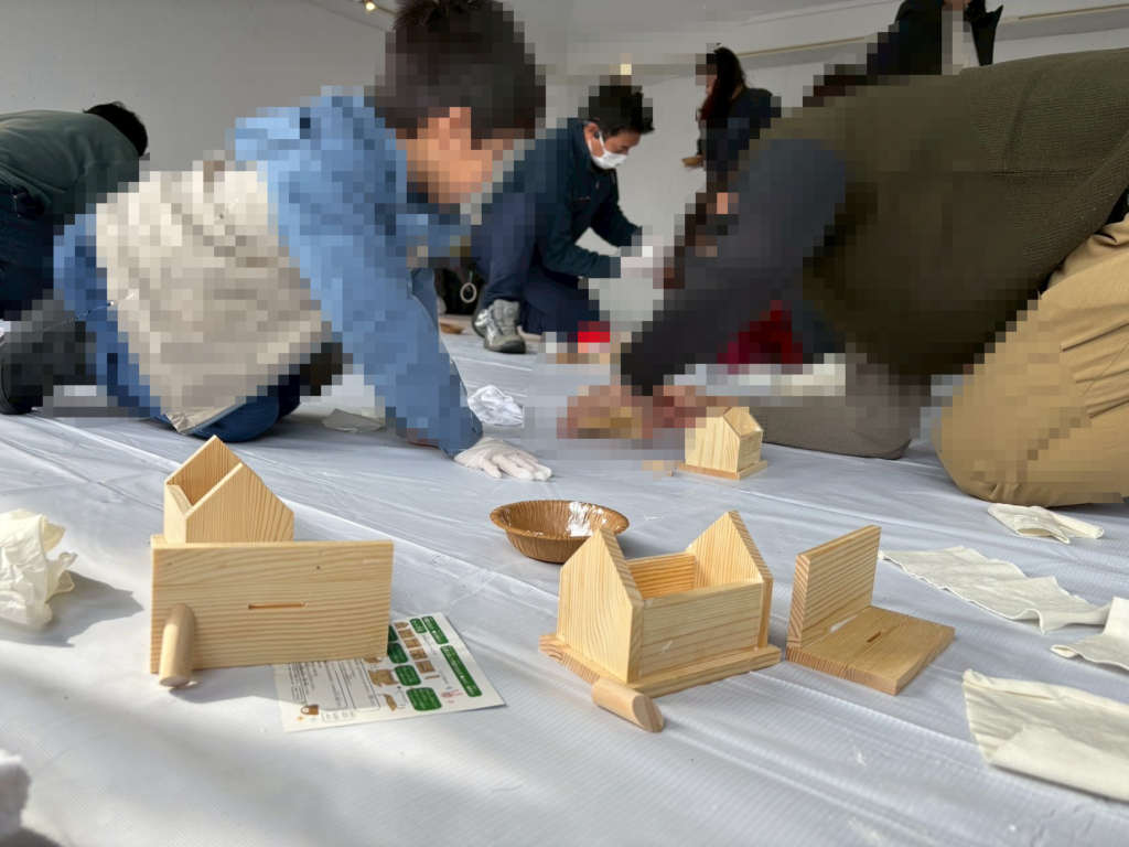 今回の日曜大工体験イベントは家型の貯金箱が制作しました。釘を使わずボンドで接着し、色をすきなように混ぜて着色しました。個性が出てみている私たちも楽しくなりました。