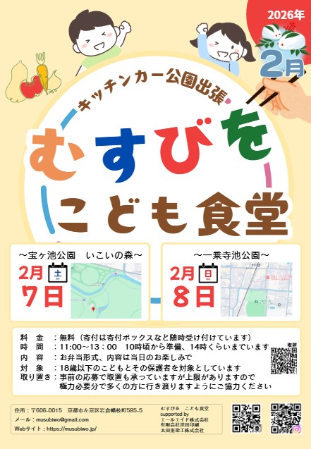 備 考:むすびをこども食堂は屋外での提供のため、衛生管理の観点からお弁当でのお渡しをしています。公園でお召し上がりいただいても構いませんし、お持ち帰りいただいても構いません。