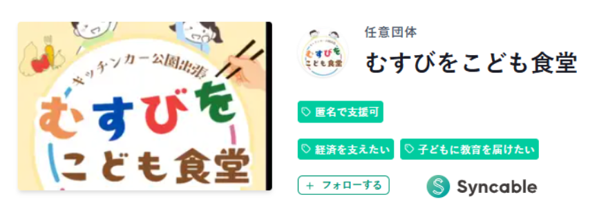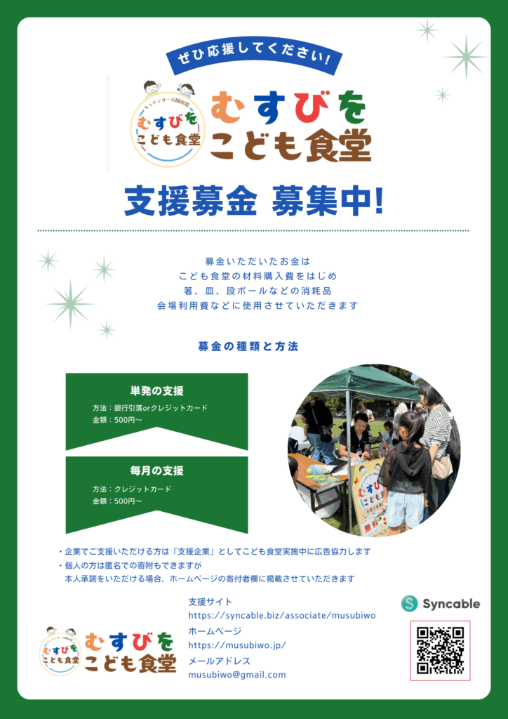 今月より寄付プラットフォーム「シンカブル(Syncable)」にて、クレジットカードでの寄付受付を開始しました。単月のご支援でも、年間を通じた継続のご支援でも、無理のない範囲でご参加いただけます。ご寄付いただいた方は、ご希望に応じてホームページなどでご紹介させていただくことも可能です。ぜひあなたの想いを、むすびをの活動に“むすび”あわせてください。子どもたちの笑顔と地域の未来をつくる力を、共に育んでいけたら幸いです。